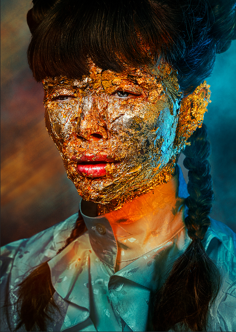 Den gyllene smärtbildningen, självporträtt november 2025 Sorgen bor i svärtan av fårorna som lagrar de gyllene stunderna och däremellan finns sprickbildningar där ljuset tar sig in.